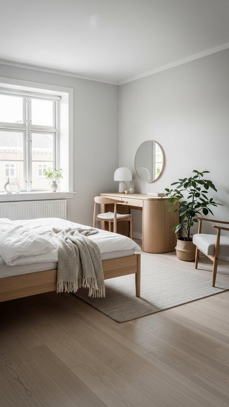 When you strip a bedroom to its essentials, Scandinavian minimal retreat feels calm and purposeful: pale wood floors, crisp white linens, and a single textured throw invite touch while soft, diffused light sculpts the space.