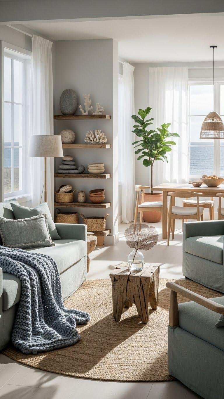 You’ll layer seafoam textiles, breezy linens, and woven rugs, add driftwood accents and open shelving, and welcome salt-scented air.