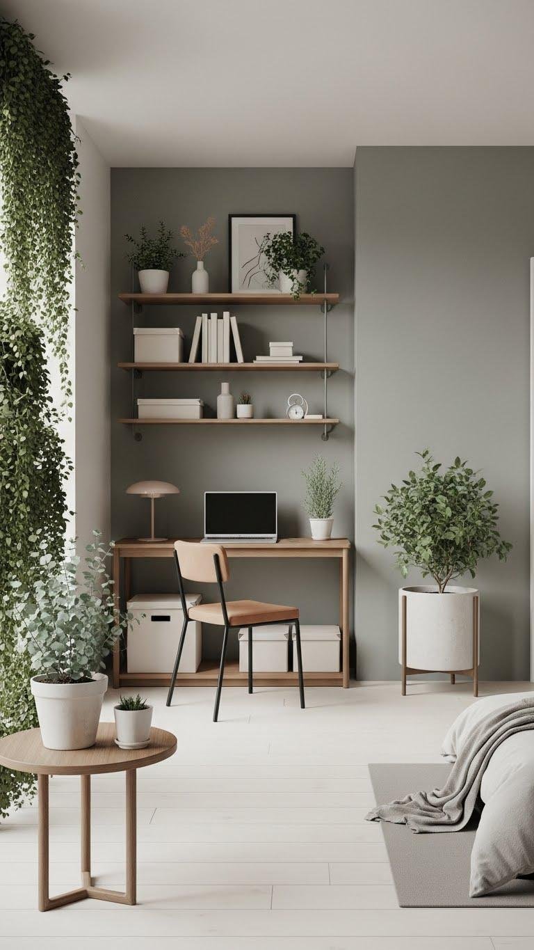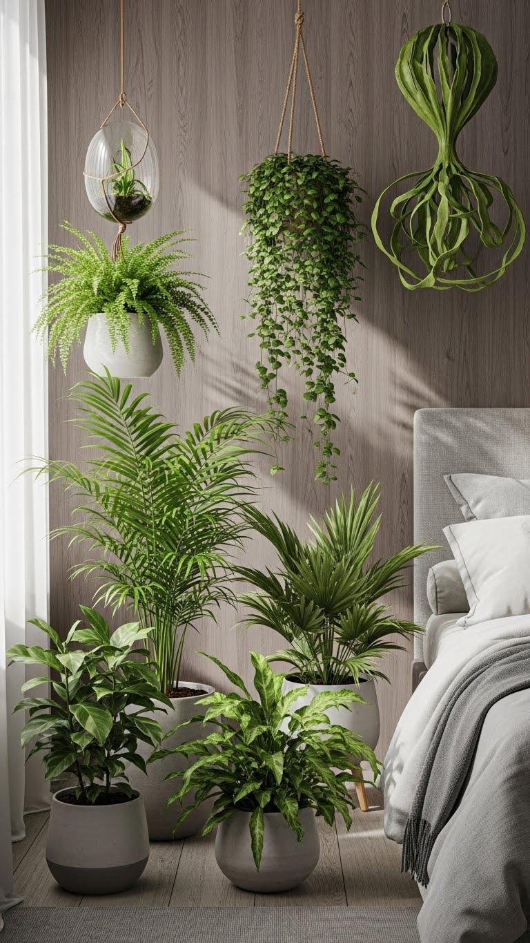 Drawing in greenery softens the bedroom into a Botanical Calm Nook that feels alive but low-key; you’ll layer potted palms, trailing vines, and sculptural ferns against matte wood and linen to create pockets of hush.