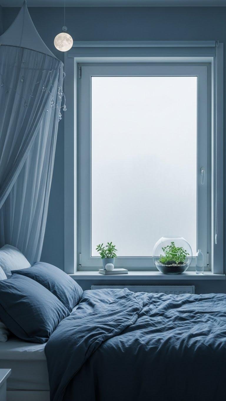 When soft, misty blues wash the walls, the room feels like an invitation to slow down; you lean into muted indigo linens, a moonlit canopy draping above while a foggy window blurs the outside and calms your breath.