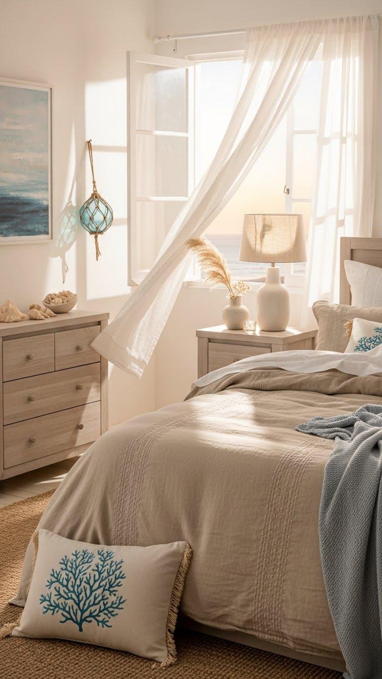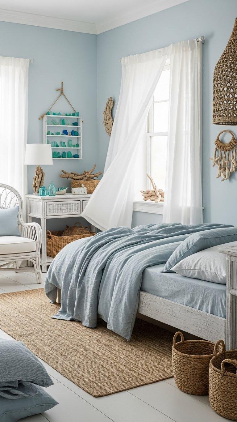 If you want a bedroom that feels like a seaside retreat, lean into pale blues, weathered whites, and natural textures that invite salt-tinged air and soft light.