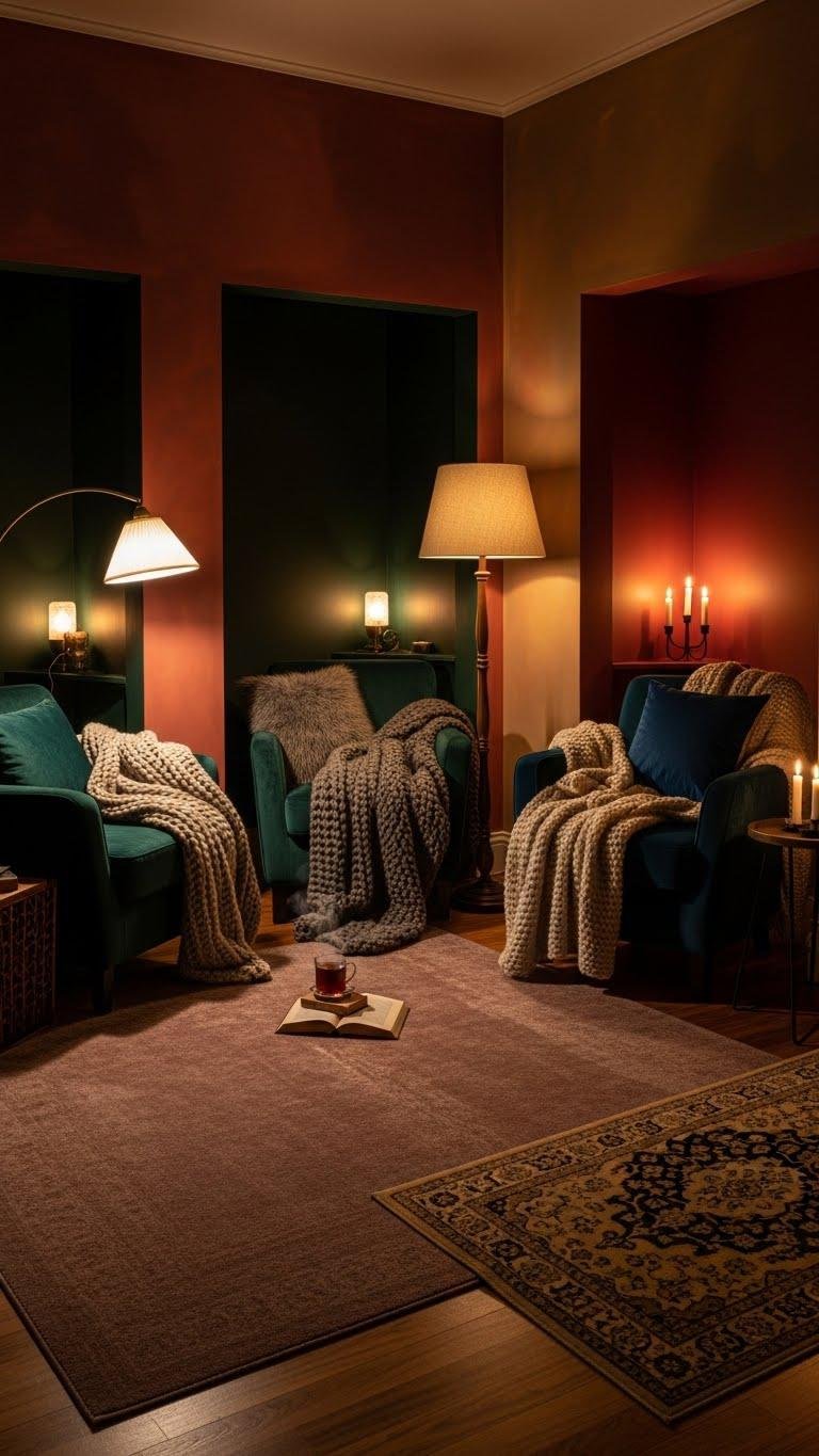 Curate shadowed alcoves for reading and slow mornings, embrace tonal depth across walls, rugs, and throws, and let the room feel protected yet unconfined—yours to drift and roam.