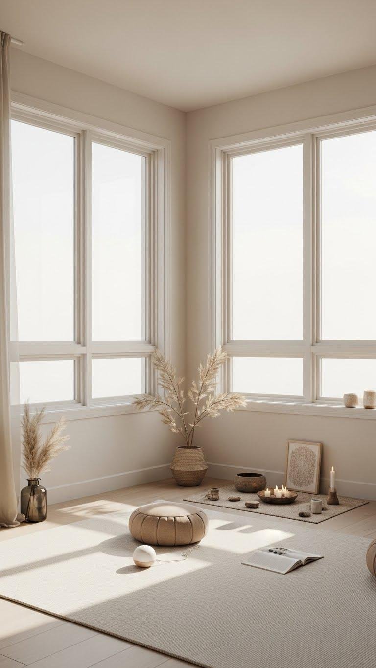 You craft a breathwork corner with a simple cushion and timer, place a small meditation altar for intention, and choose muted tones.