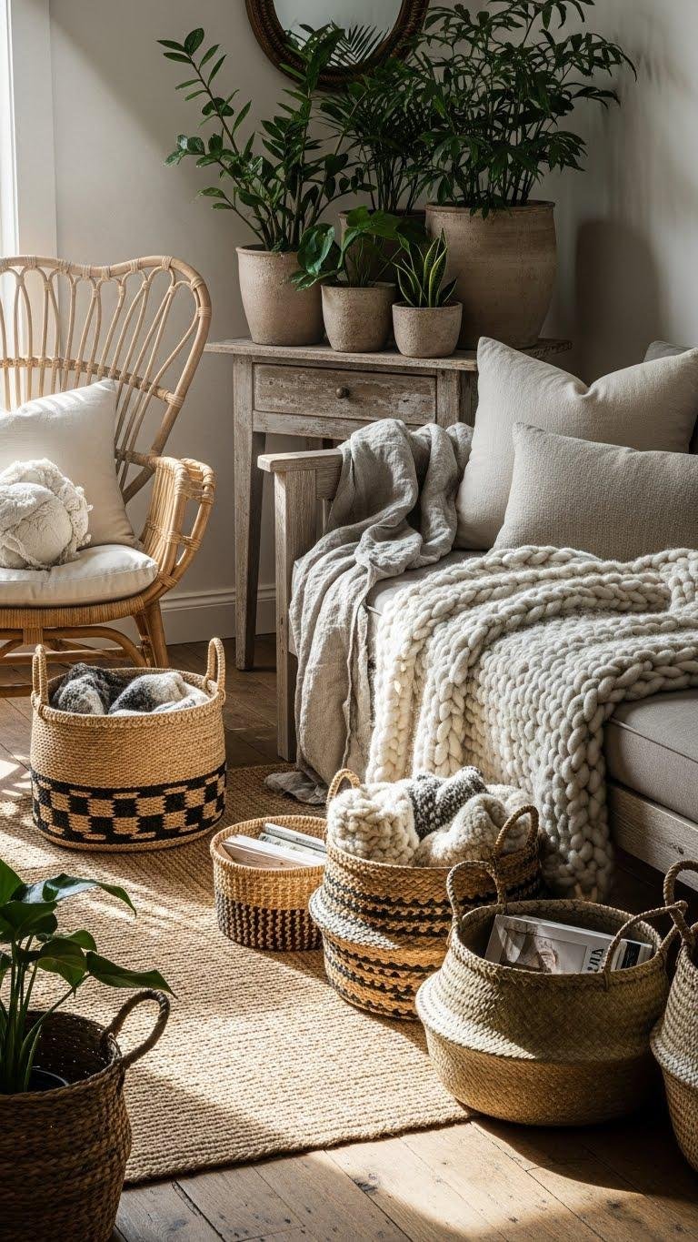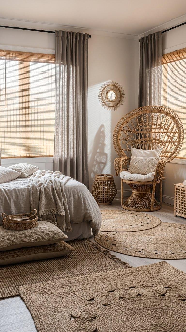 If you favor texture over gloss, let natural fibers set the tone: woven jute rugs, linen drapes, and handwoven rattan accents define a warm, tactile room that feels lived-in and calm.