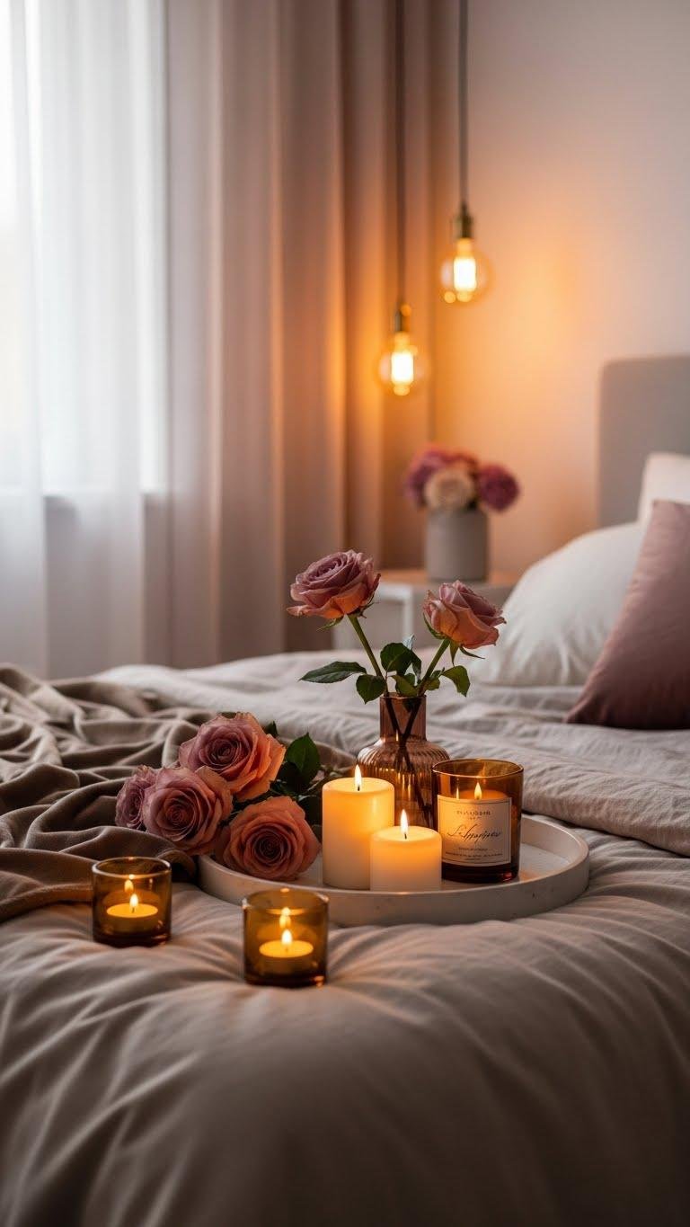 Want your bedroom to feel like a private candlelit retreat? You’ll craft a soft glow romantic room with a candlelit vignette on a low tray, amber tea lights, and warm-toned bulbs.