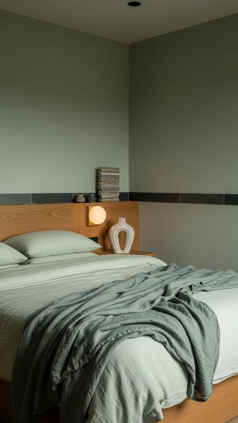Because soft sage and cool stone work together to quiet your mind, imagine a bedroom where matte plaster walls and slate accents ground pale green textiles and warm oak finishes.