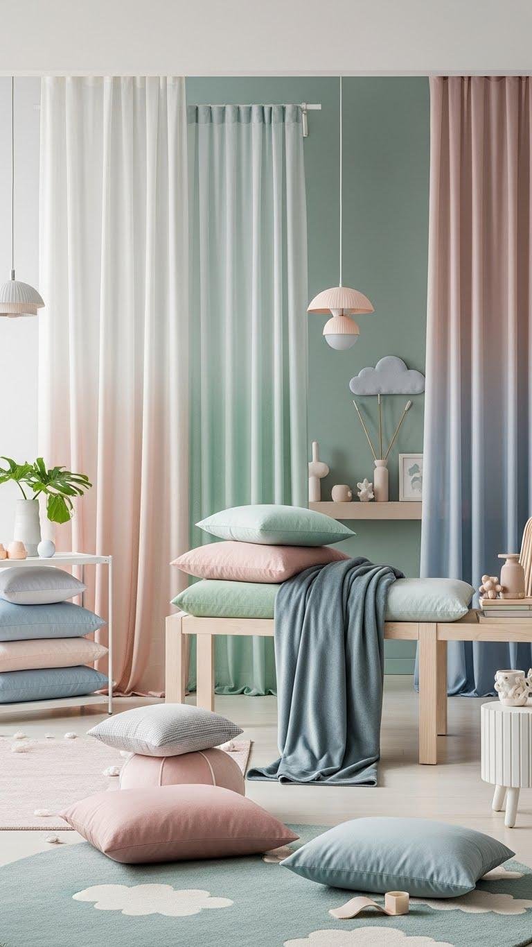 When you step into a Soft Pastel Dreamscape, muted blushes, minty greens, and powder blues wash the room in gentle light, creating a quiet, uplifting hush; layered textiles—sheer voile, brushed cotton, and a velvety throw—invite touch while pale wood and lacquered accents keep the look fresh and modern.