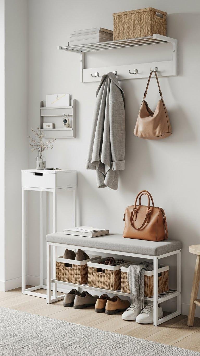 Place a narrow bench for quick sits, a slim console for mail and keys, and wall hooks for coats and bags.