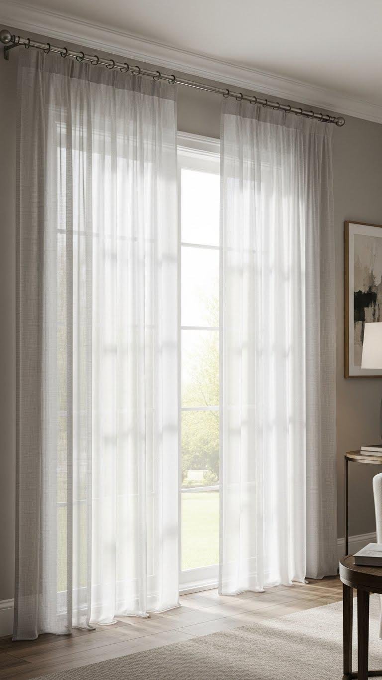 Choose lightweight fabrics for effortless light filtering and minimal sheer maintenance. Mount simple rod hardware high and wide to widen sightlines. If you need privacy or insulation, add a discreet thermal lining behind the sheers. Keep colors neutral to amplify calm and freedom.