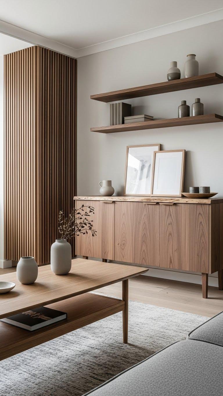 Natural wood brings warmth and tactile richness that grounds a clean, neutral palette—think oak coffee tables, walnut shelving, or ash picture frames that introduce grain and color without clutter.