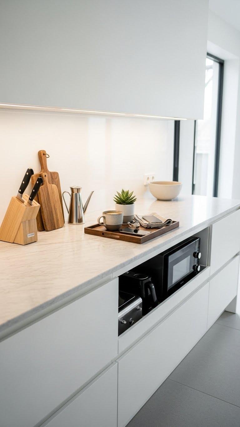 Use appliance hiders or pull-out cabinets to reclaim surface space, so cooking stays calm and freeing.
