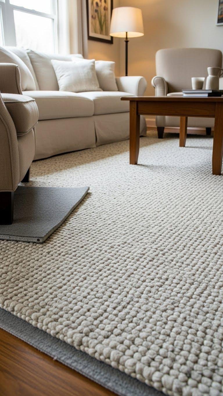 Add underlay padding to prevent slipping and protect floors. Keep colors neutral or low-contrast patterns so the rug feels calm and free.