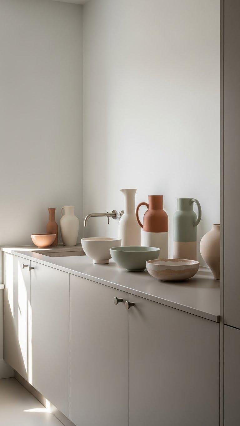 Arrange a small collection of vases and bowls to give your surfaces personality without cluttering them. You’ll pick a few matte glazed pieces in varied heights and shapes, mixing smooth curves with raw textures.