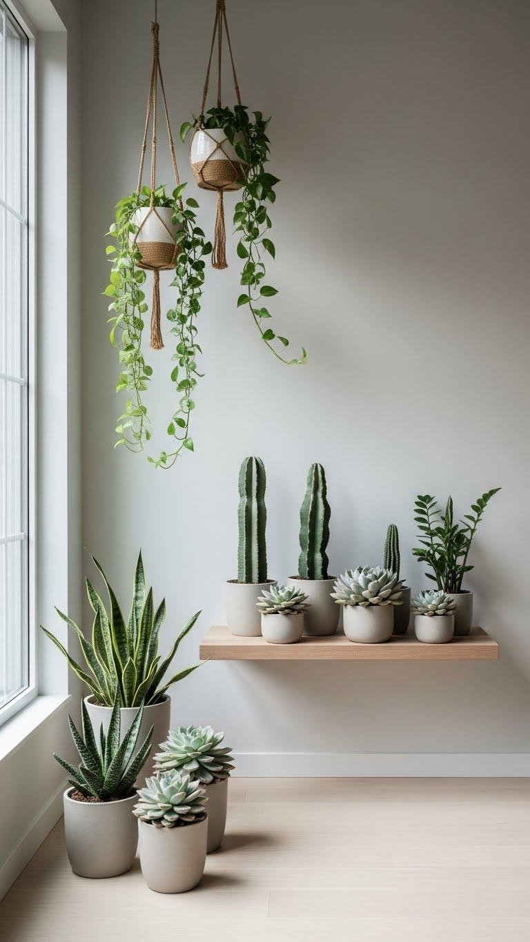 Often, a few well-placed plants in simple pots will instantly warm a clean, minimal space without cluttering it. You’ll choose sculptural succulents, mix compact succulent arrangements on shelves, and add airier greens in hanging planters to free floor space.