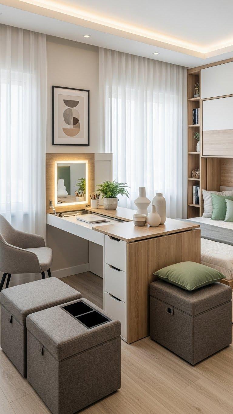 Maximize every square foot with multifunctional pieces that look intentional, not improvised. You choose curated, efficient solutions—space saving desks that double as vanity stations, fold down dining that frees floor area, dual purpose ottomans with clever compartments, and hidden storage beds that keep clutter out of sight.