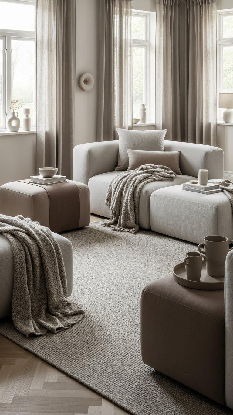 You’ll choose muted linen drapes, layered wool throws, and tactile rugs that invite barefoot wandering.