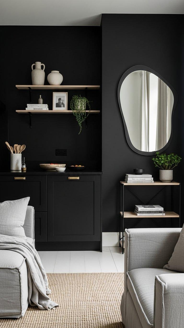Although dark walls can feel dramatic, pairing them with crisp, light accents lets you achieve a modern, layered look that still breathes—think charcoal or navy backdrops punctuated by linen throws, pale wood, and brass details.