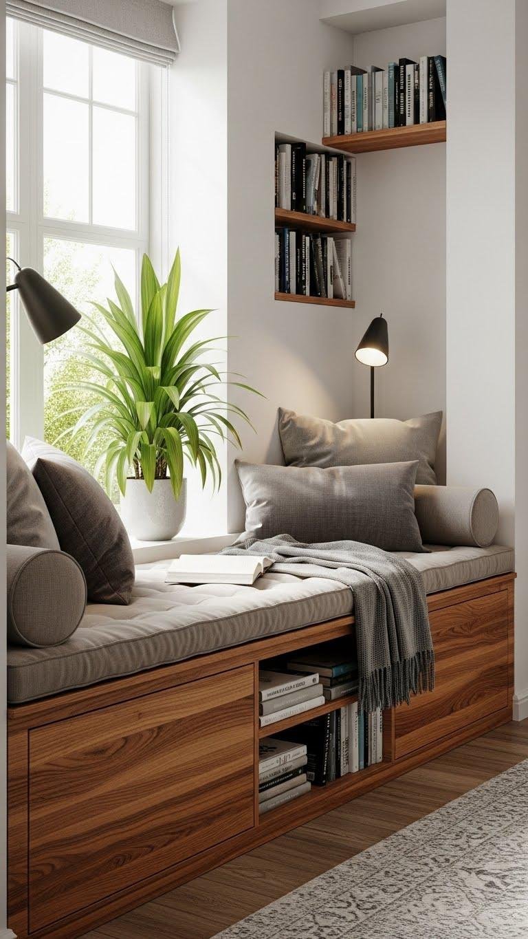 A window seat or tucked reading corner transforms an idle alcove into a daily refuge you actually use—think built-in benches with warm wood grain, plush cushions in muted tones, and layered throws that invite lingering.