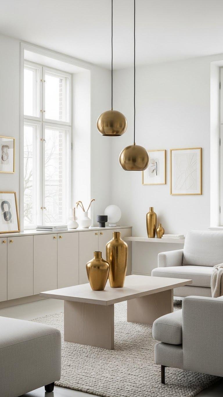 Shifting from open white walls and deliberate negativespace, warm metallics add a quiet layer of glamour that won’t overpower your minimalist gallery. You’ll balance matte textures with subtle brass hardware on cabinets and lighting, and place sculptural gold vases as focal points.
