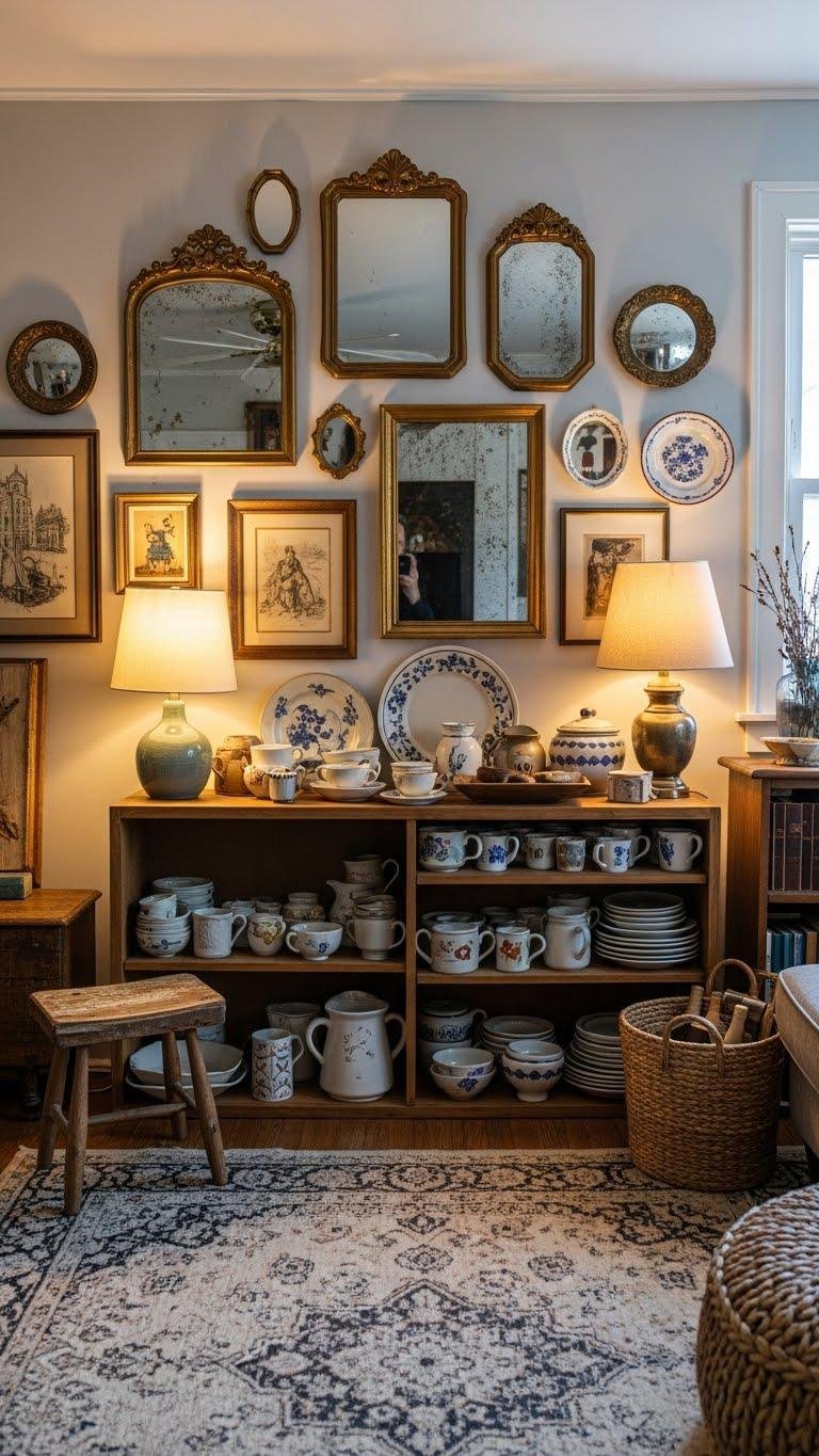 Mix in heirloom pieces and flea-market finds to craft a space that feels collected rather than contrived. You’ll layer textures, patina, and playful contrasts—think antique mirrors anchoring a gallery wall and thrifted ceramics styled on open surfaces.