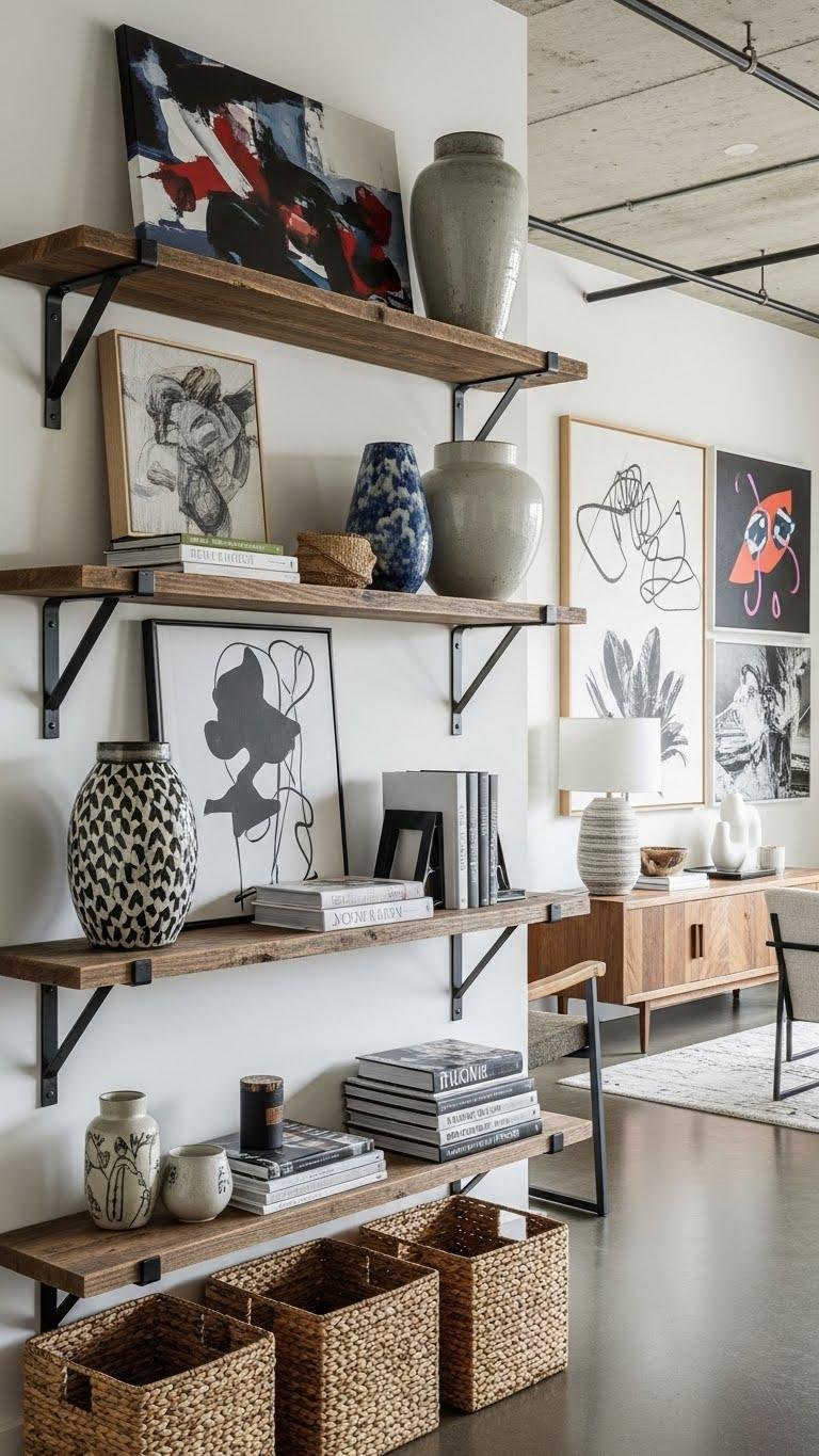 Lean into raw materials and clean lines as you set up open shelving that shows off both function and flair—steel brackets and reclaimed wood create a backbone for bold accents like oversized art, sculptural vases, and a few statement books.
