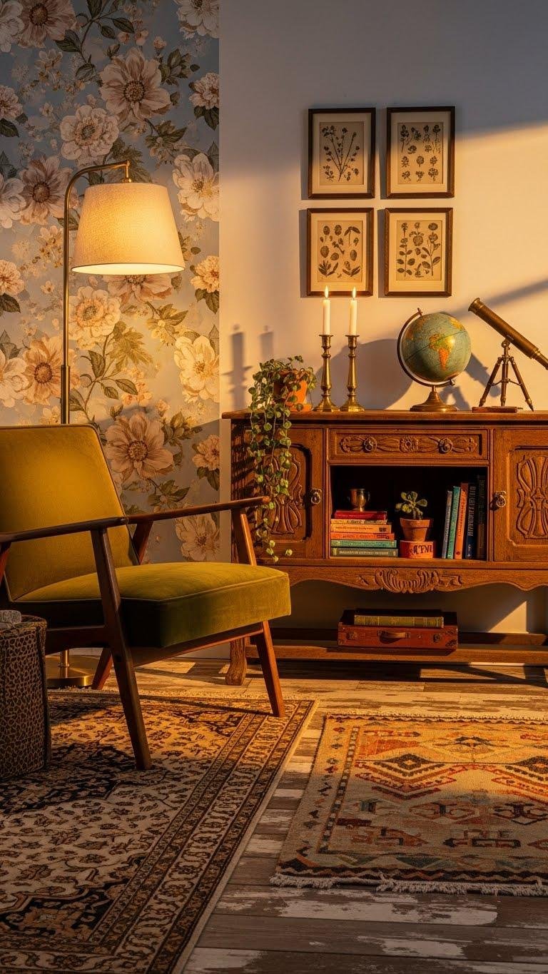 Think of a vintage-revival corner as a curated time capsule that brings personality and patina into your modern layout; you’ll pair a statement mid-century chair or flea-market sideboard with carefully chosen textiles and art to make the area feel intentional, not cluttered.