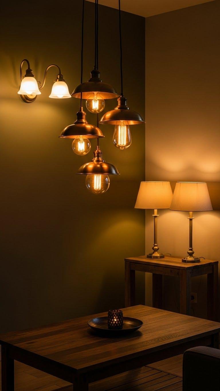 You’ll choose antique sconces for intimate corners, pendant clusters over relaxed nooks, and table lamps with warm bulbs. Let brass patina show—it’s honest, soulful, and on-trend—mixing with textiles and art so your space feels free, intentional, and quietly refined.