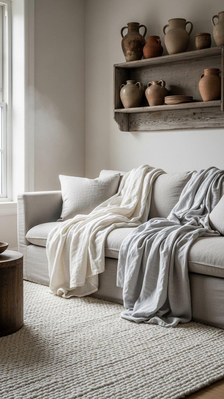 Often the quickest way to change a room’s mood is by layering soft textiles and a plush rug—you’ll add warmth, sound dampening, and tactile contrast all at once. Choose handwoven throws for lived-in texture and breathable comfort, draping them over sofas or chairs.