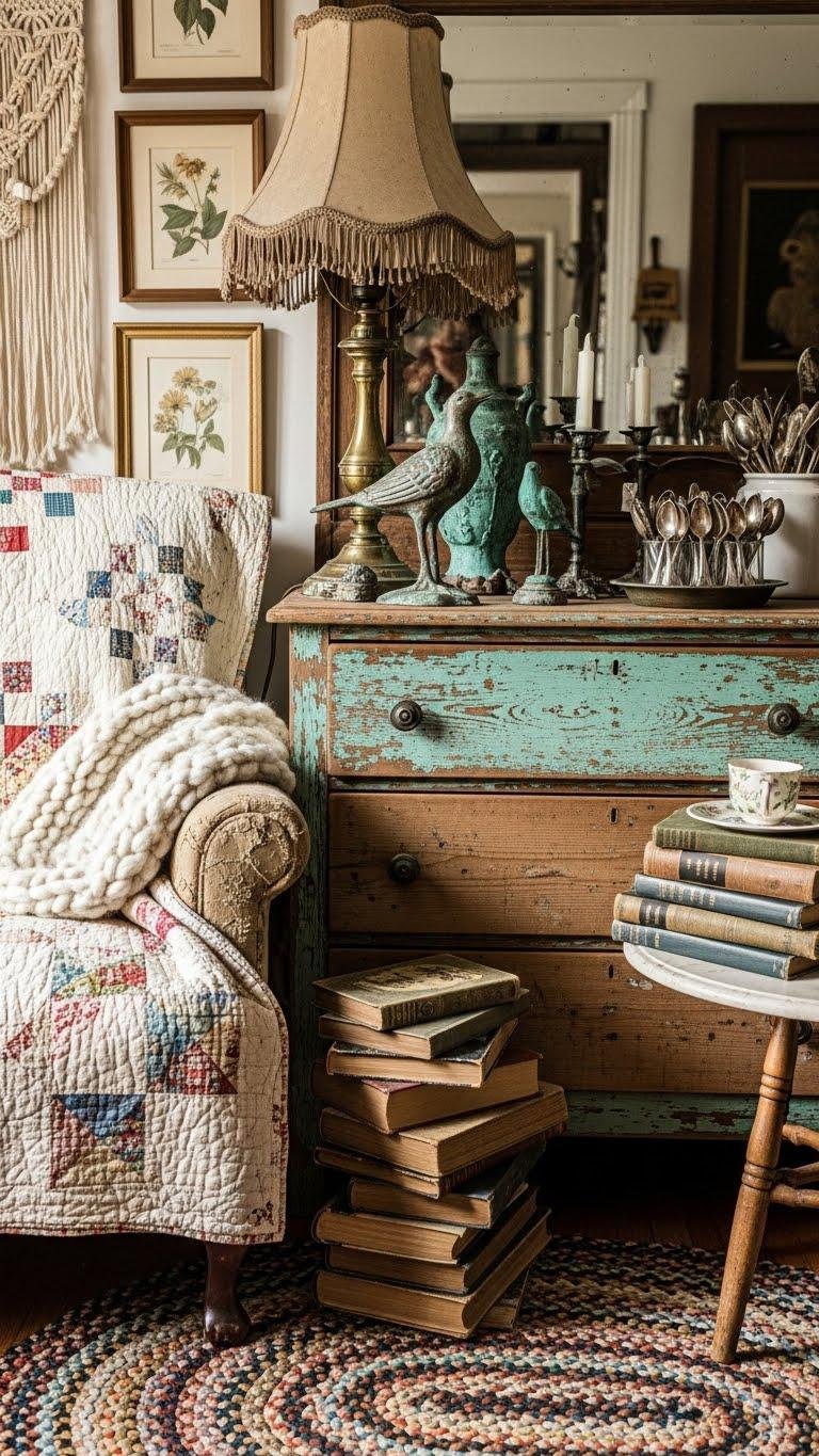 Curate functional vintage items as focal points, creating a lived-in, free-spirited vibe that feels intentional and modern.