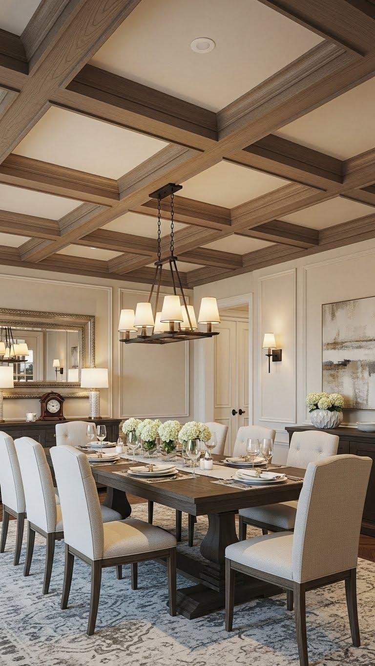 When you crown your dining room with a coffered ceiling, the whole space feels thoughtfully composed and instantly more luxurious; the recessed panels add rhythm, depth, and a play of light that turns meals into moments.
