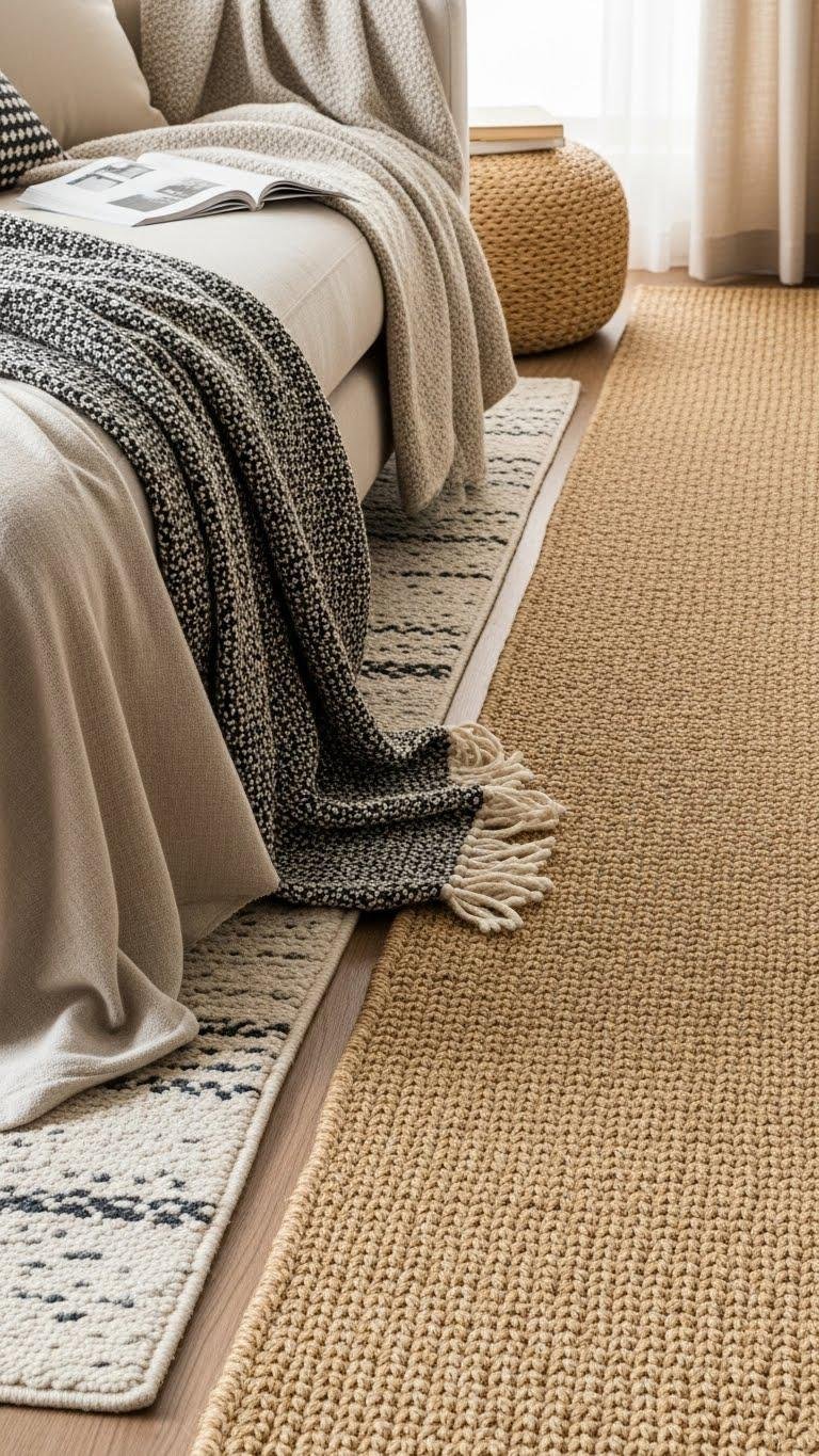 Pair cozy pile rugs with natural sisal runners to define paths, balancing softness and structure while keeping your space free-spirited and grounded.