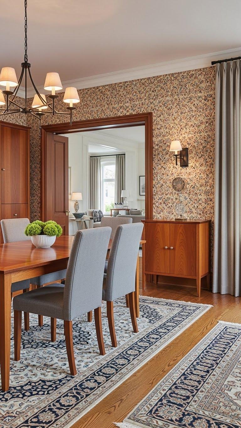 You’ll mix lacquered wood, matte textiles, and subtle coded patterns on rugs or wallpaper. Balance richness with light fixtures and open layouts so you can host freely and linger comfortably.