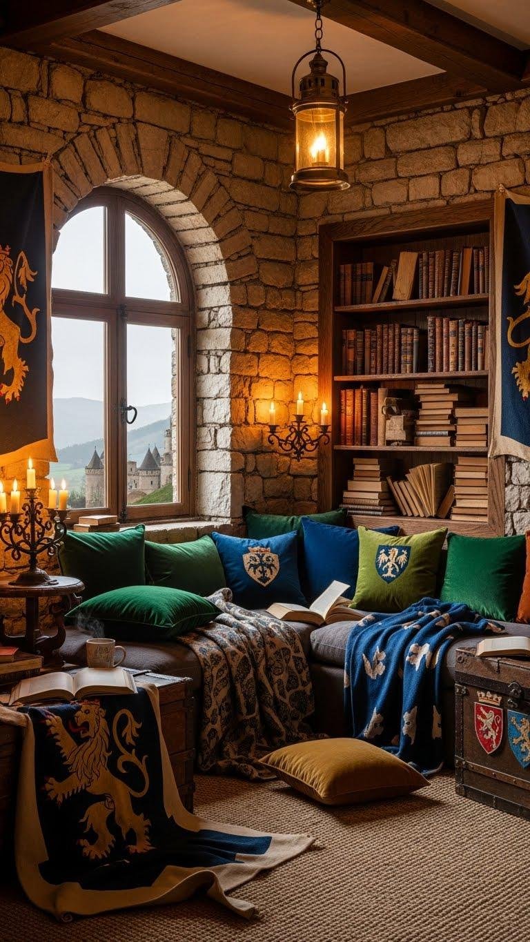 You’ll lean into a turret alcove or window seat, add warm lighting, vintage books, and heraldic textiles for story-rich texture.