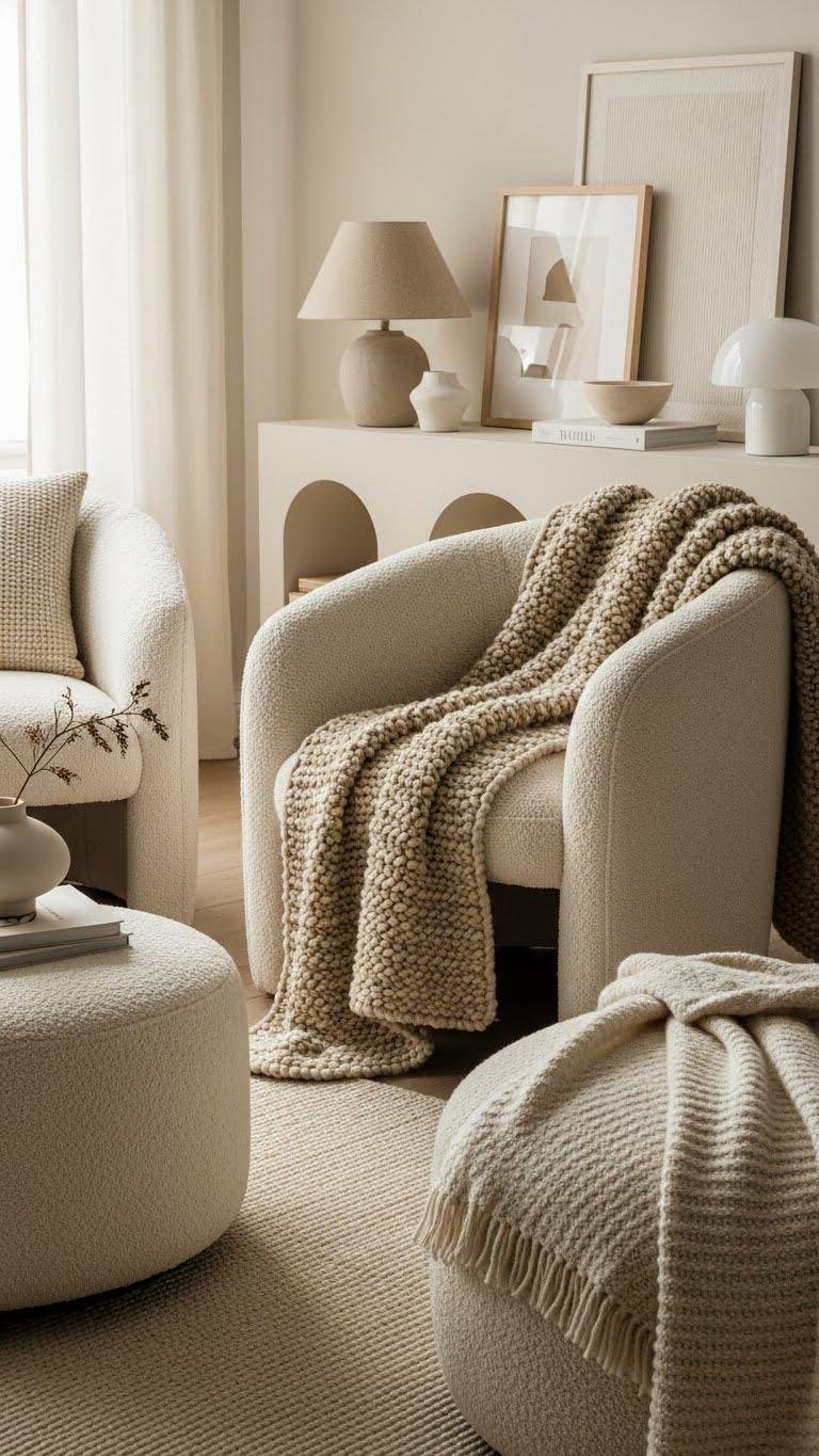 You’ll choose handwoven boucle throws, alpaca wools blankets, and curved bouclé chairs to create cozy layers. Mix neutral tones, organic shapes, and minimal clutter so your space feels liberated, tactile, and effortlessly curated.