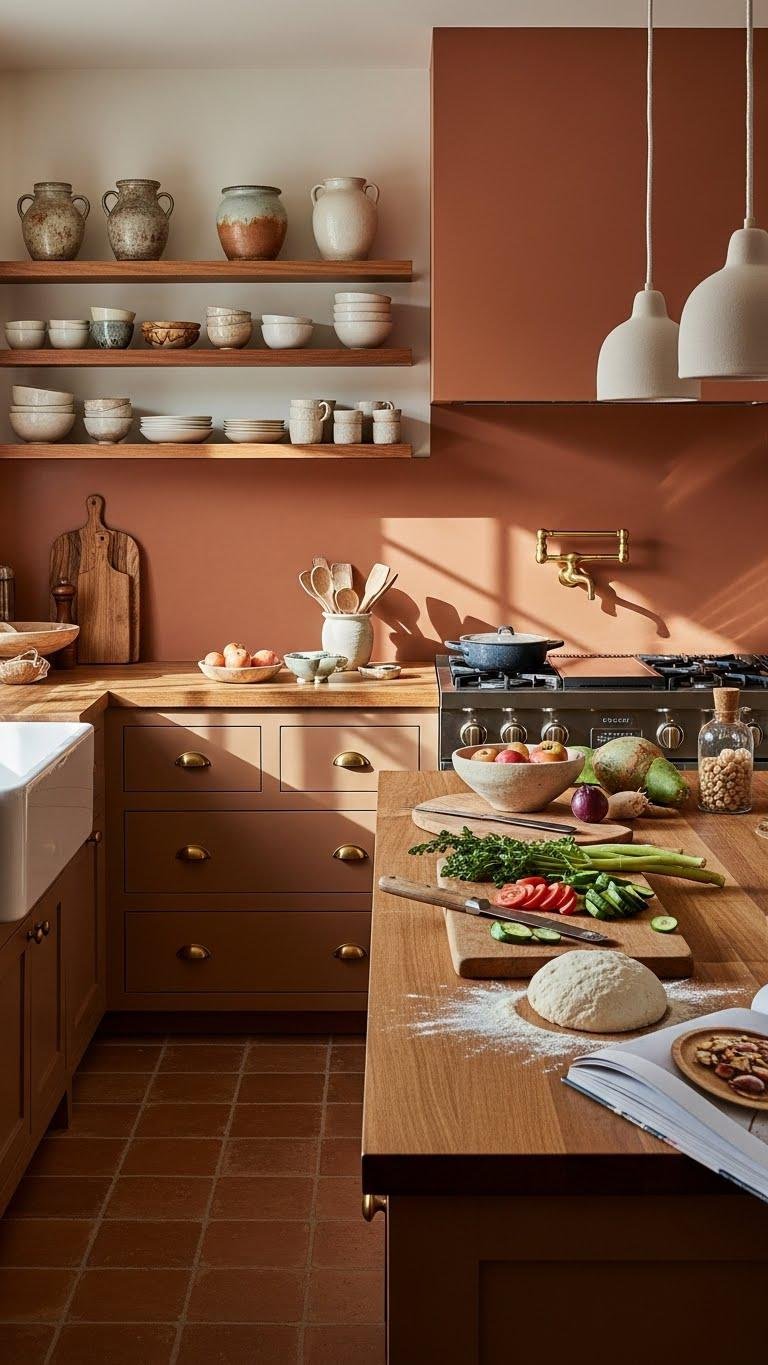 You’ll pair a terracotta backsplash with open shelving, warm wood counters, and brass fittings for contrast.