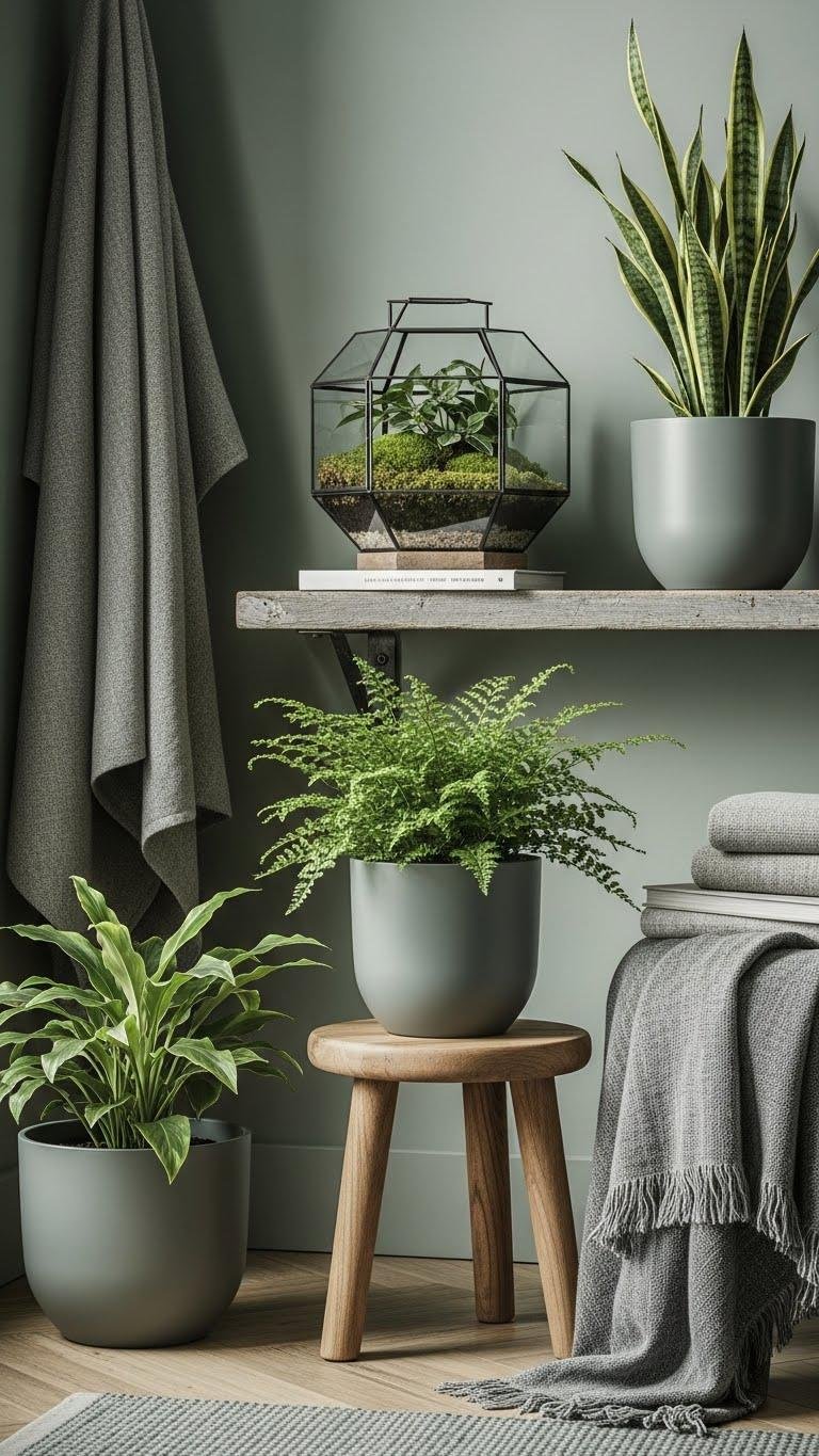 Because muted greens read as both calming and contemporary, you can carve small botanical corners that feel curated rather than cluttered.