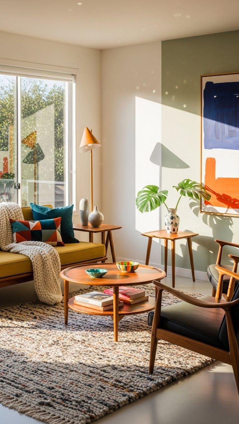 You’ll layer retro teak pieces with cozy throws, mix angular silhouettes against soft curves, and choose bold colors sparingly.