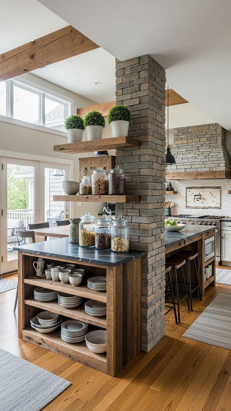 You’ll pair a reclaimed beam with open shelving, a stone backsplash behind the stove, or stacked stone accents. Keep finishes natural, mix soft textiles, and let textures evoke relaxed, liberated comfort.