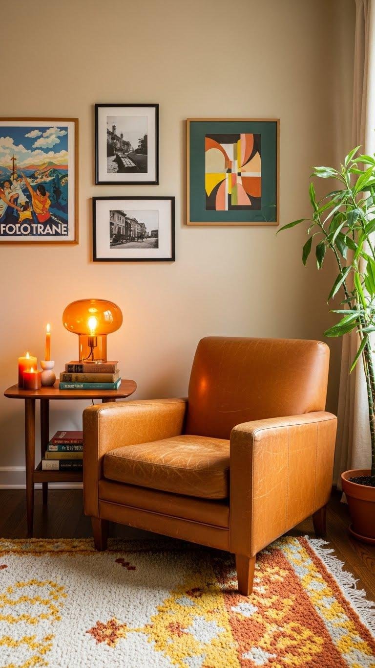 Let patina juxtaposition tell a story: a worn leather chair beside a sleek teak side table. Add amber accents—a glass lamp, candles—to warm the palette.