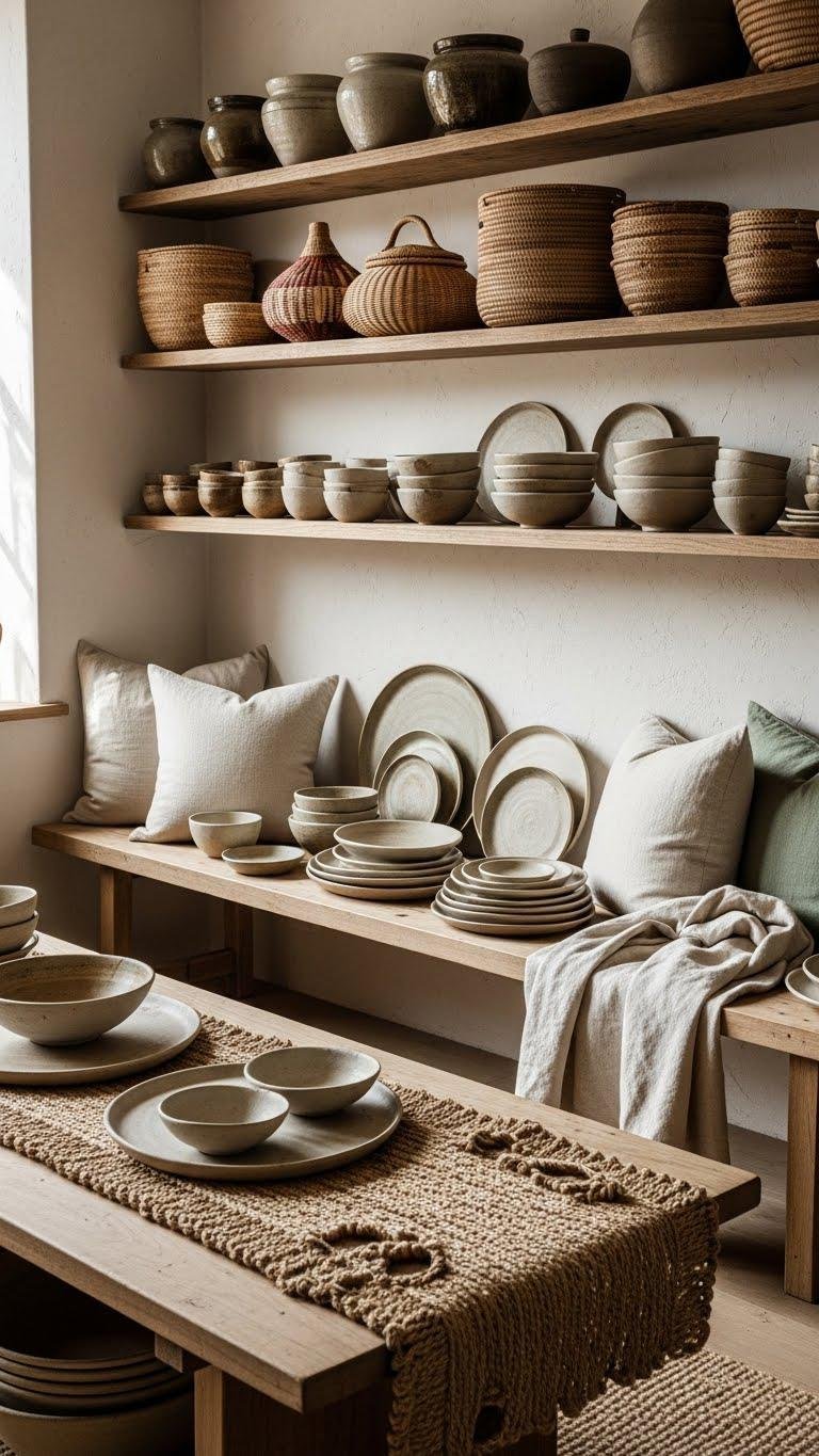Mix handcrafted ceramics with organic linens on benches and window seats, add a rough-hewn table runner, and let natural imperfections guide your layout. You’ll feel freer, grounded, and cozy.