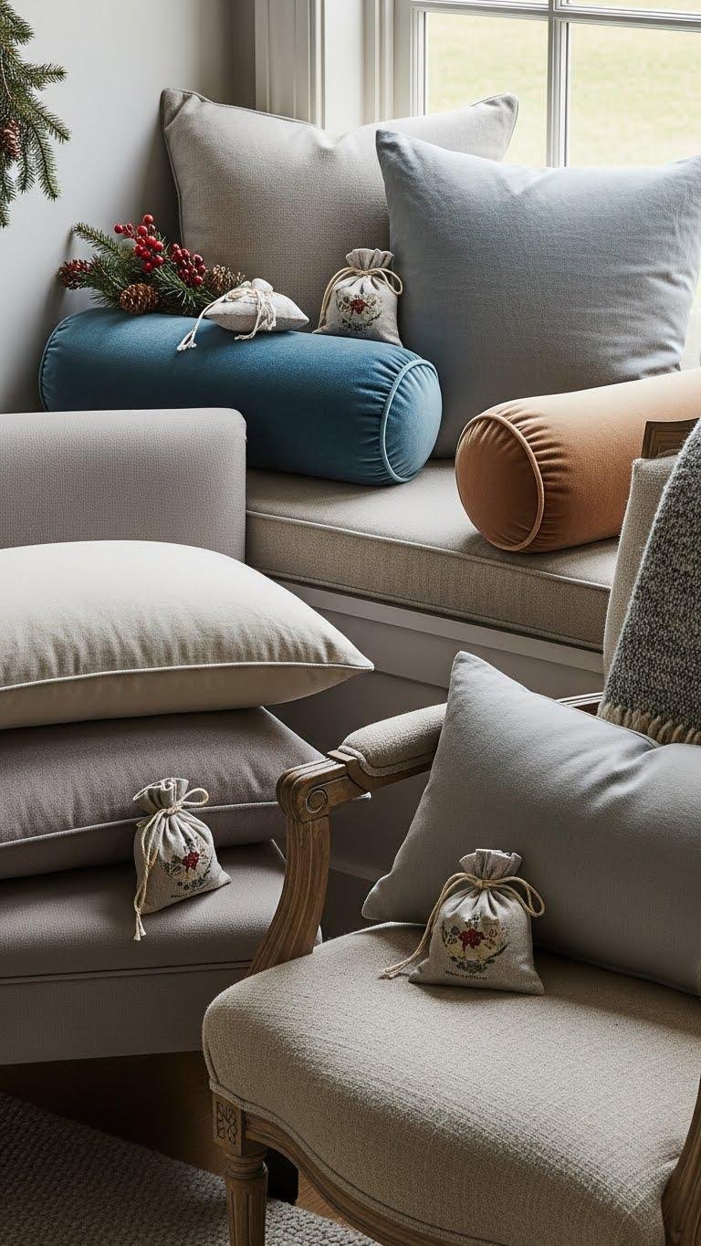 Mix velvet bolsters with linen cushions, pick a freeing color palette, and tuck scented sachets beneath them. Rotate cushions seasonally and keep the arrangement relaxed and personal.