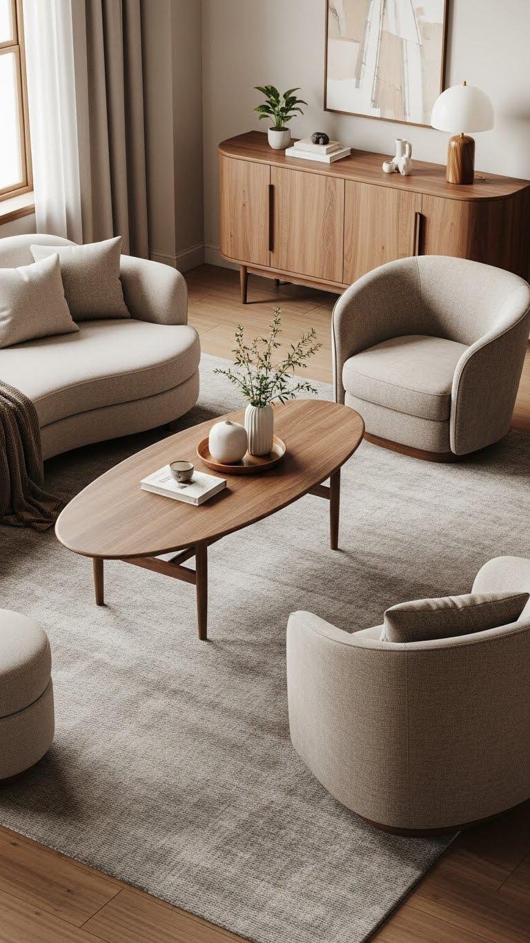 Embrace rounded ottomans for flexible seating and low barriers, pair with curved credenzas to maintain flow, and pick warm woods or soft fabrics.