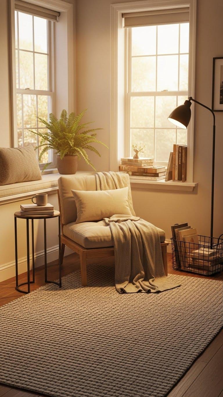 Add a floor lamp, a book basket, a cozy window seat feel, and a potted fern for calm.