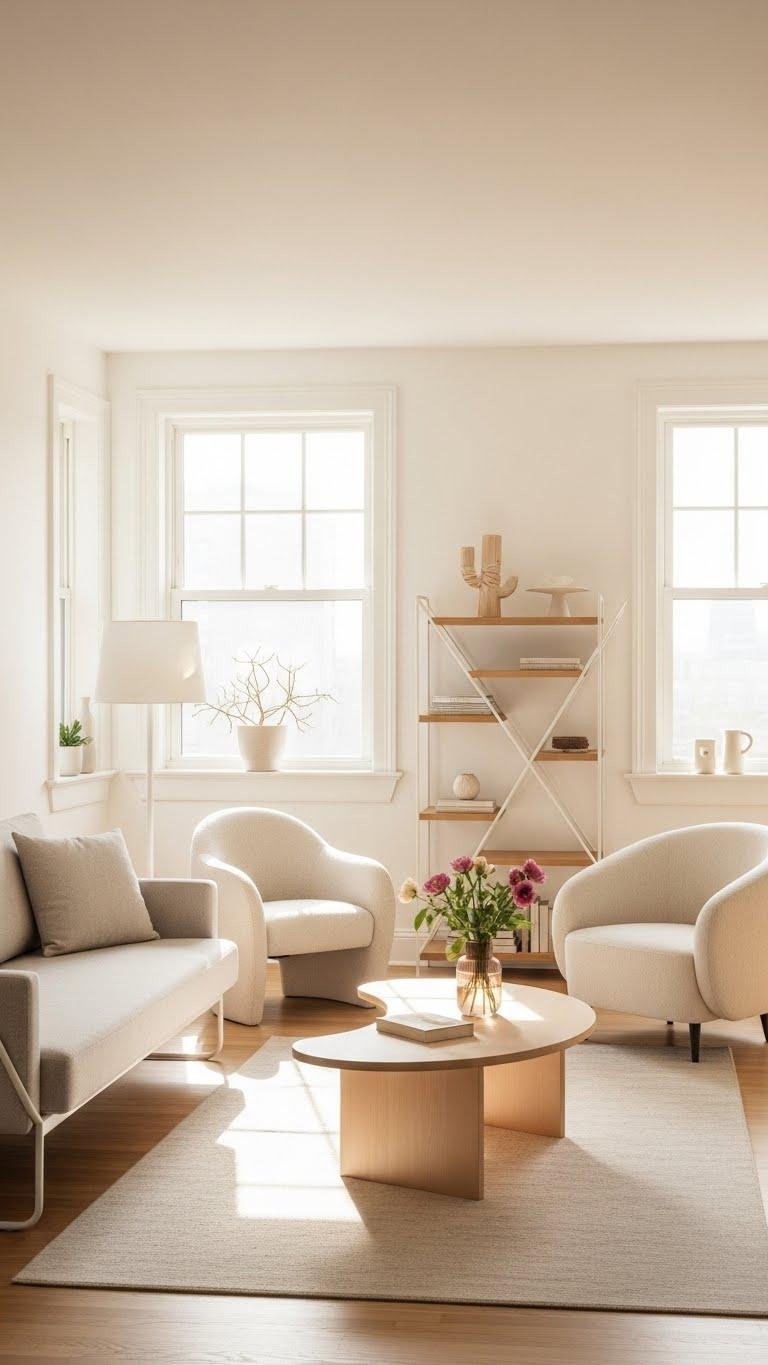 Let the sun-lit openness from bare windows guide your furniture choices: pair pieces with clean, geometric frames—think slim-legged sofas and angular shelving—with a few soft-curved items like a rounded armchair or a crescent coffee table.
