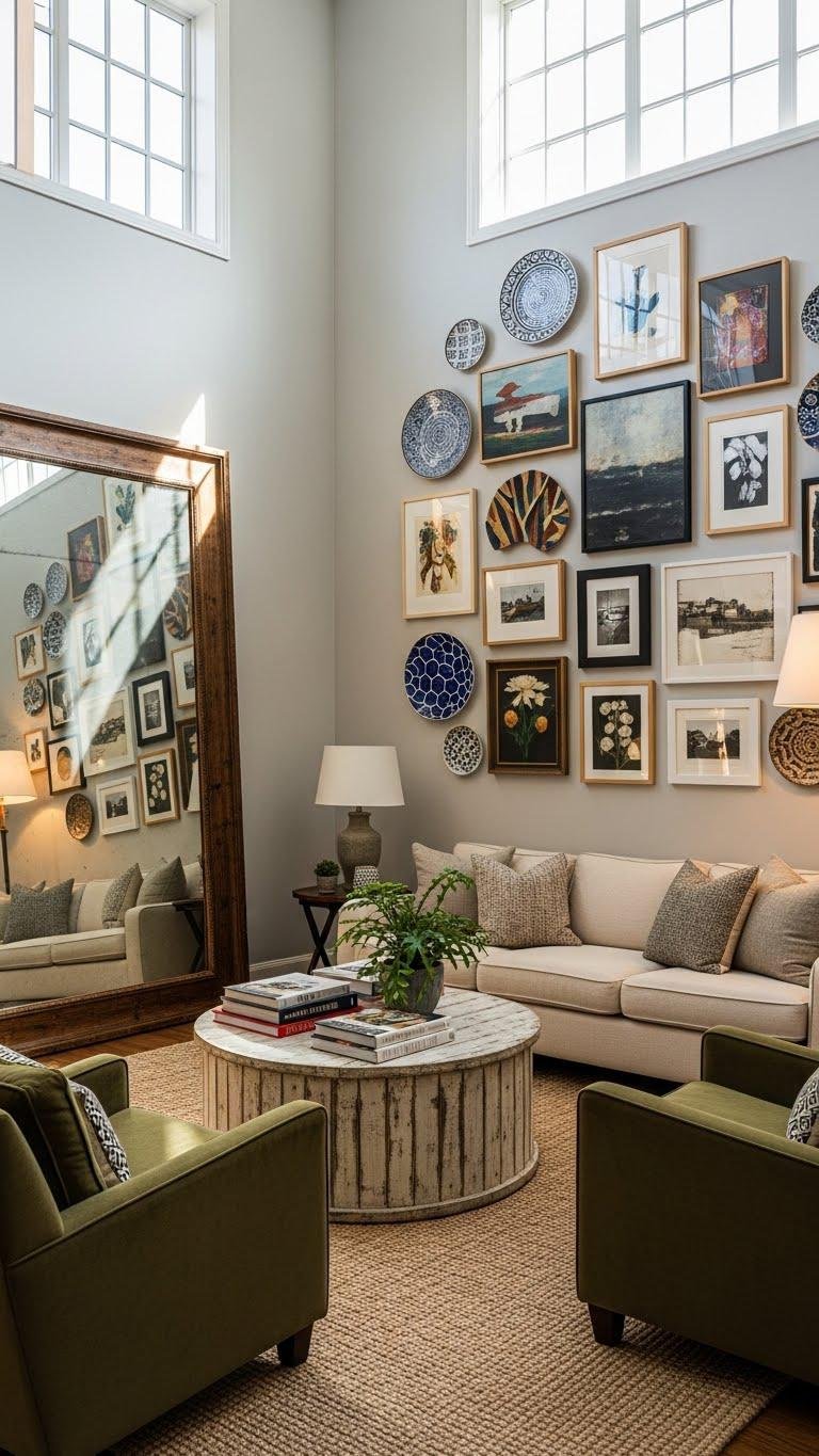 Although a single oversized mirror can instantly double a room’s perceived space and bounce sunlight deeper into corners, a thoughtfully arranged collage—whether of frames, art, or sculptural plates—creates rhythm and personality that anchors your layout.