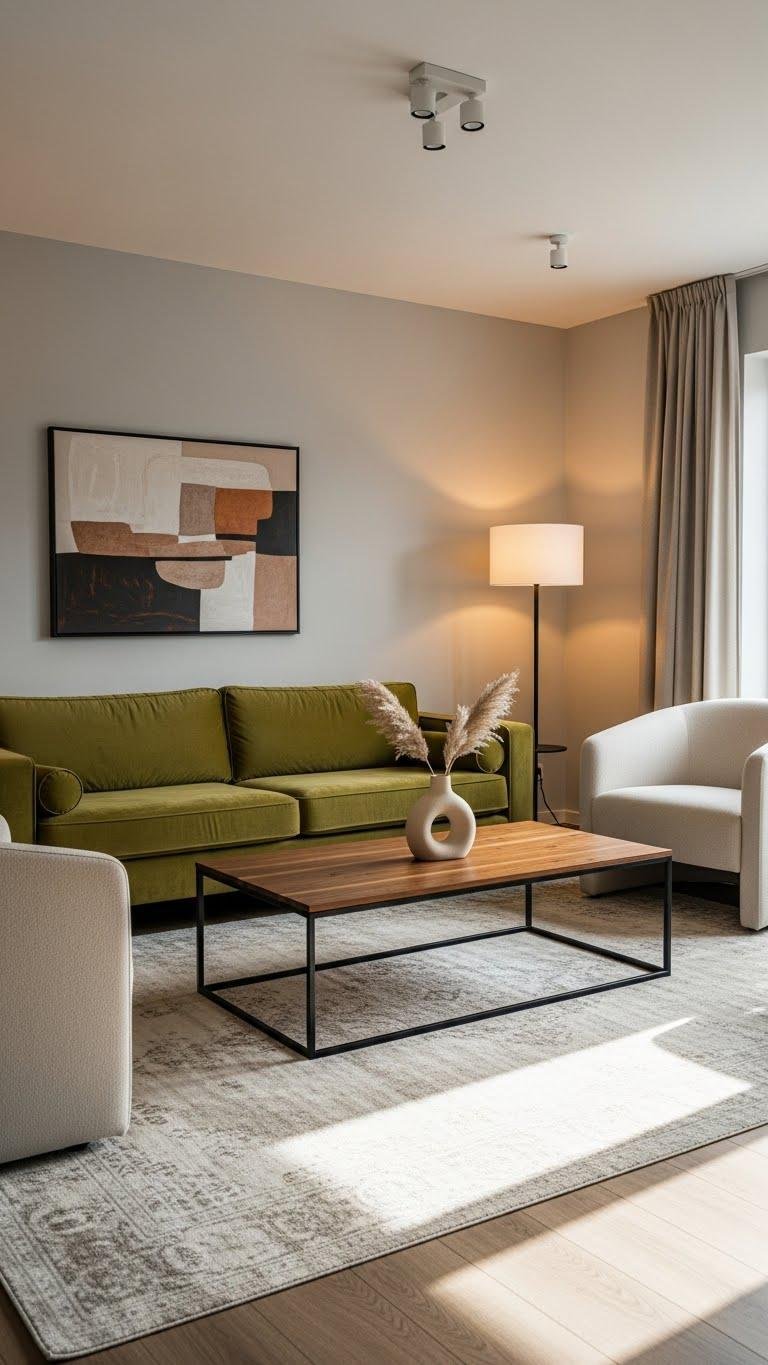 After grounding your seating with a substantial rug, let the walls remain just as intentional: rotate a small selection of curated art to keep the room feeling fresh without fuss.