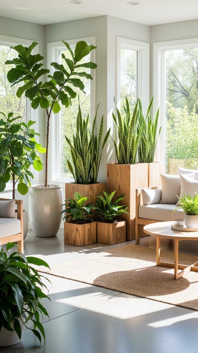 Embrace vertical living with tall pots or staggered planters, letting green anchor corners and invite movement without clutter. You gain calm, freedom, and low-maintenance presence.