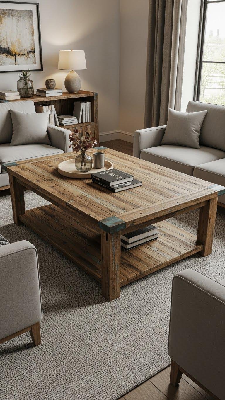 Anchor your seating with a distressed wood table that brings warmth and history without fuss. You’ll choose pieces with reclaimed finishes and subtle patina accents that feel lived-in, not staged.