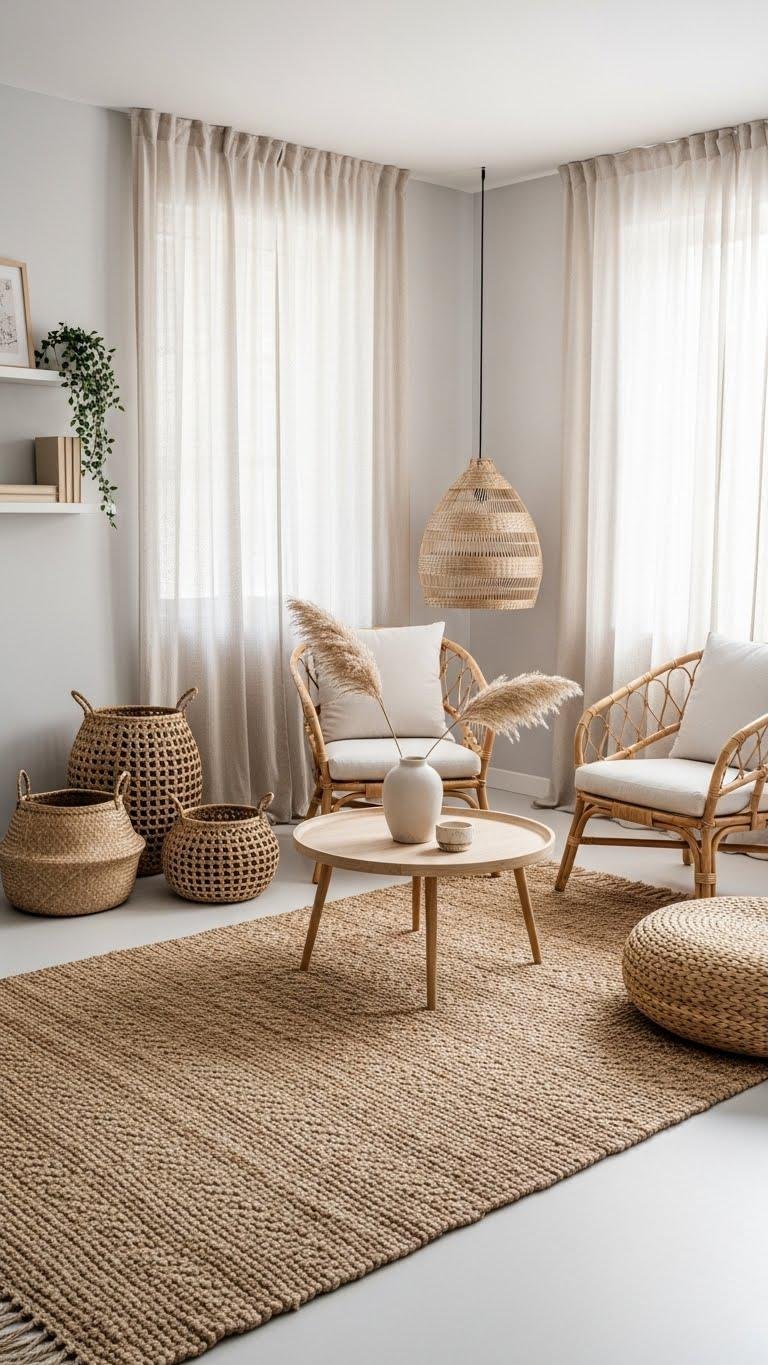 Let a woven pendant define a corner and a seagrass pouf offer flexible seating. You’ll balance clean lines with organic tactility, creating a calm, breathable space that feels lived-in yet unrestricted.