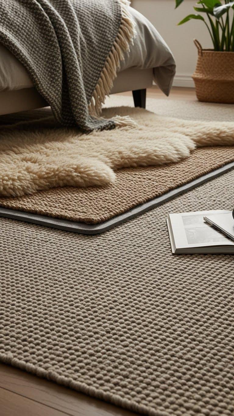 By layering rugs you’ll carve the room into purposeful pockets while adding tactile warmth underfoot; start with a large, low-pile foundation rug in a neutral weave, then place a smaller, textured rug—sheepskin, jute, or a soft wool—under the bed or seating to signal the sleeping zone and soften footsteps.